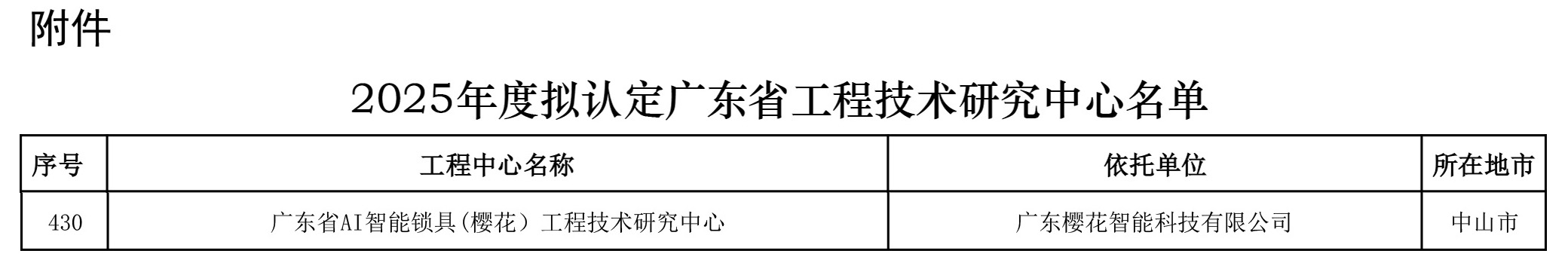 1月20日,广东省科学技术厅发布了拟认定2025年度广东省工程技术研究中心名单,广东樱花智能科技有限公司凭借在AI智能锁具领域卓越的技术研发实力与显著的产业带动效应,成功入围获批组建“广东省AI智能锁具(樱花)工程技术研究中心”。此次认定,是省级权威部门对樱花智能锁行业领先地位与硬核创新实力的强力背书,标志着公司正式跻身省级高端研发平台行列,成为驱动锁具安防产业智能化升级、攻克关键核心技术的战略创新力量。